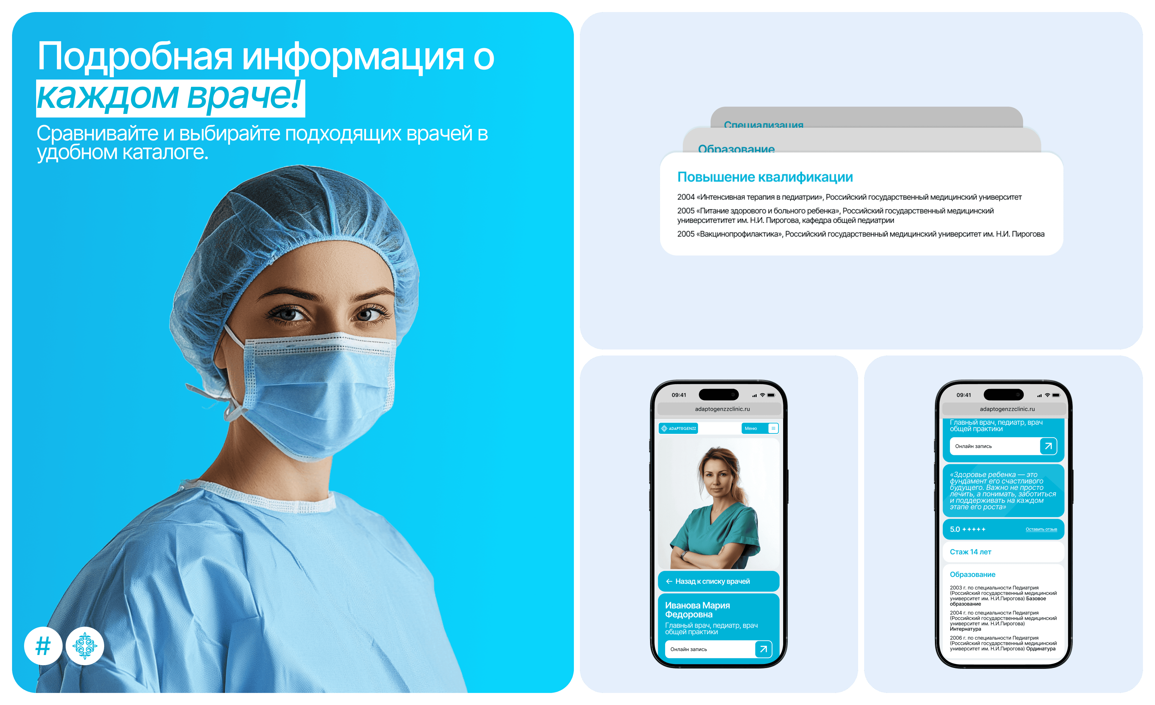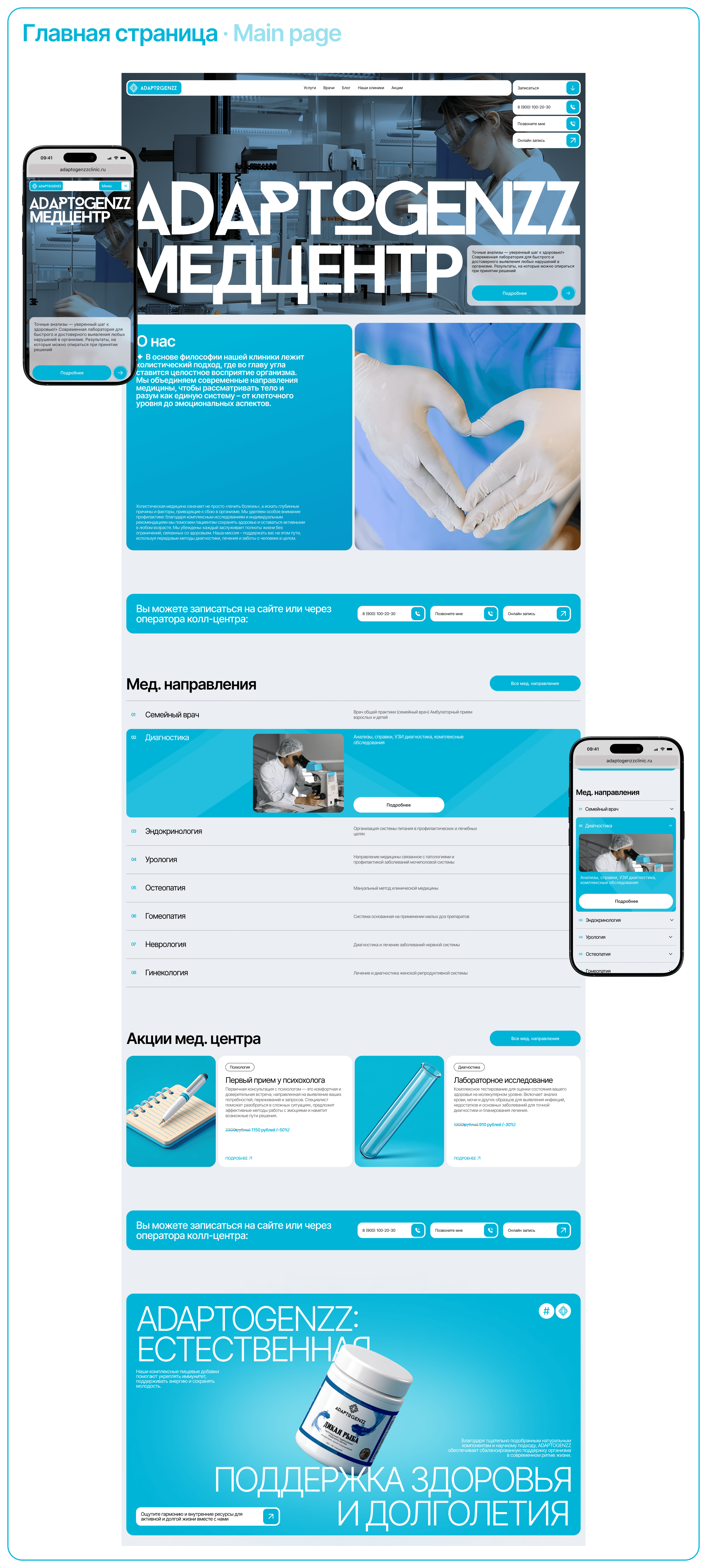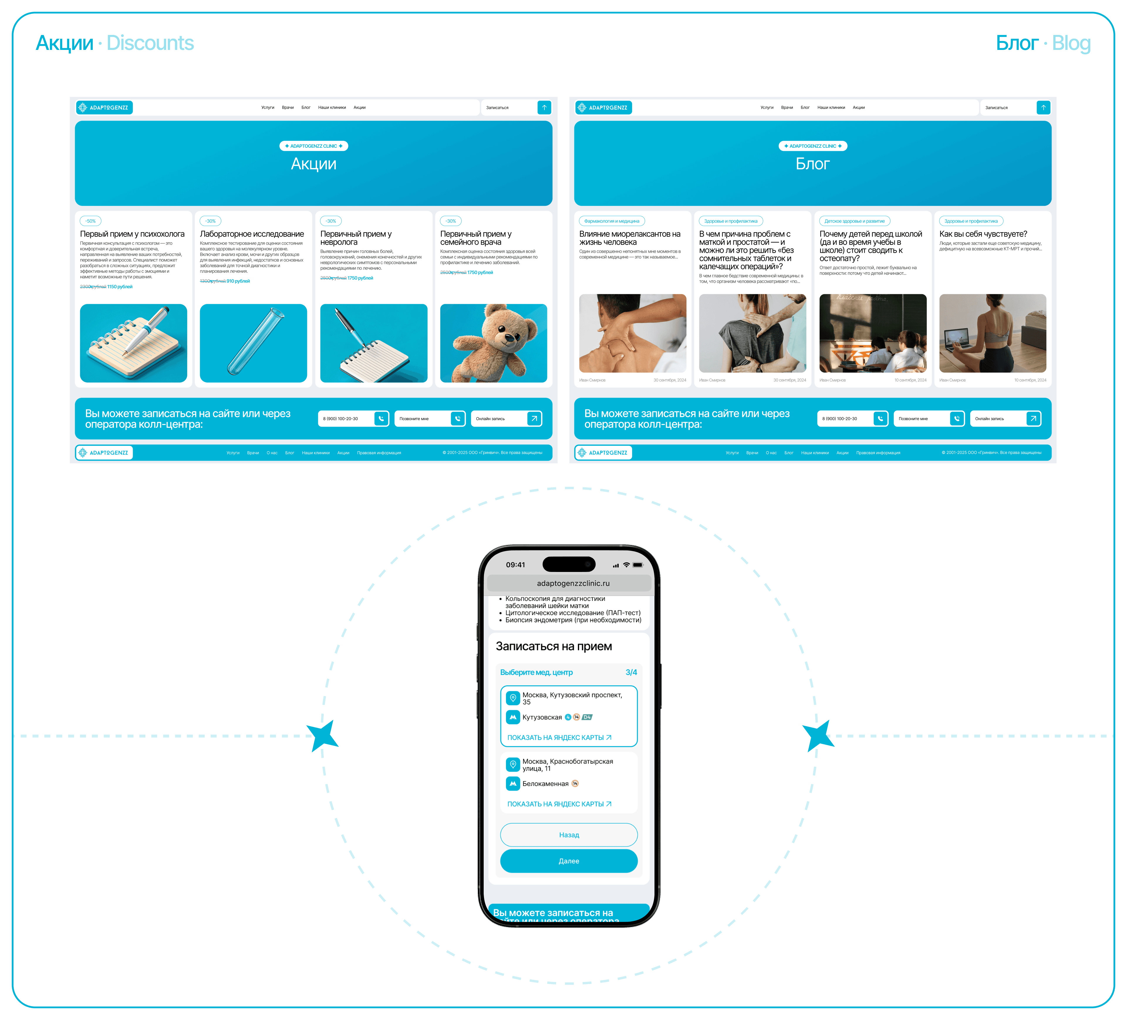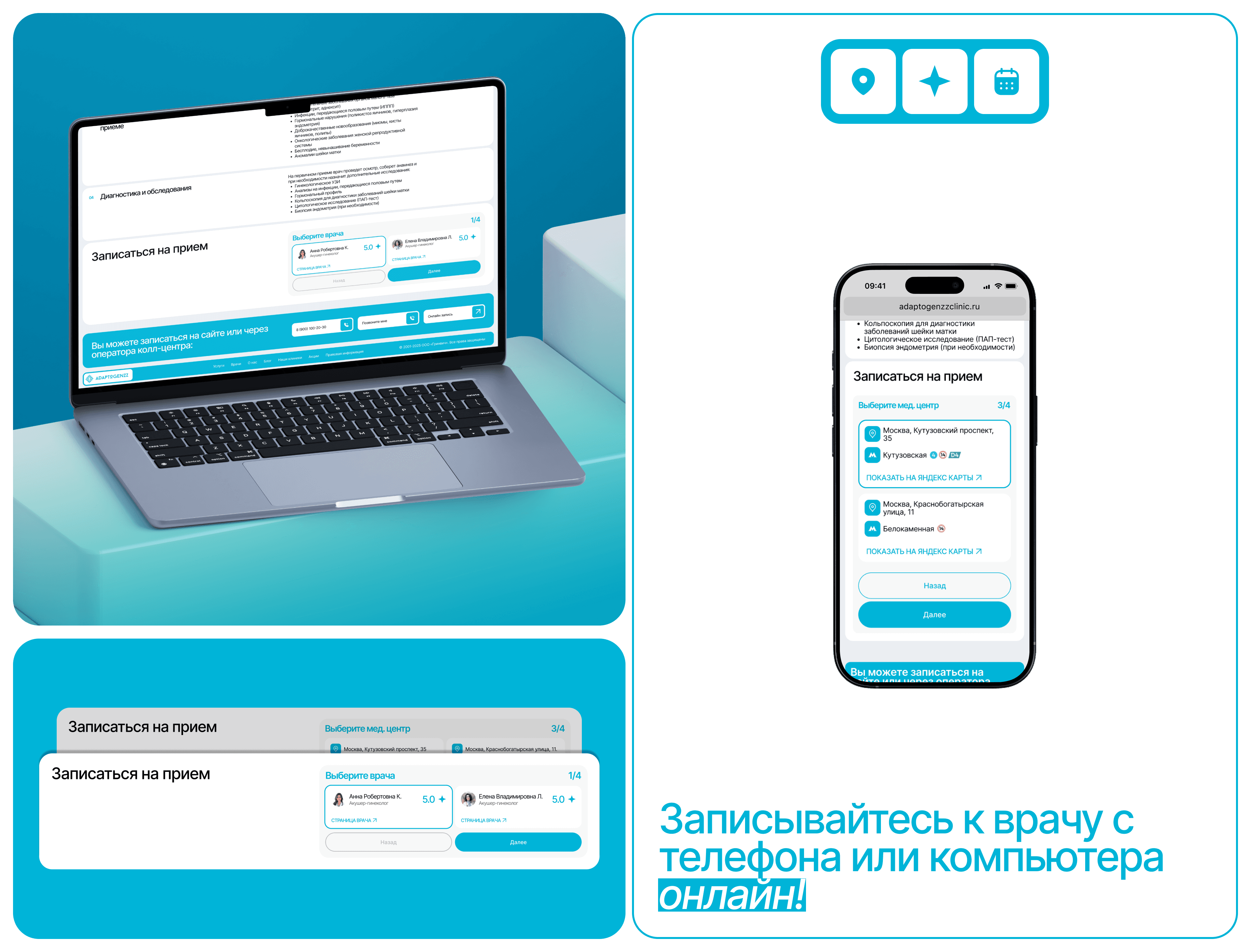 Сервис записи к врачу и корпоративные страницы для медцентра Adaptogenzz