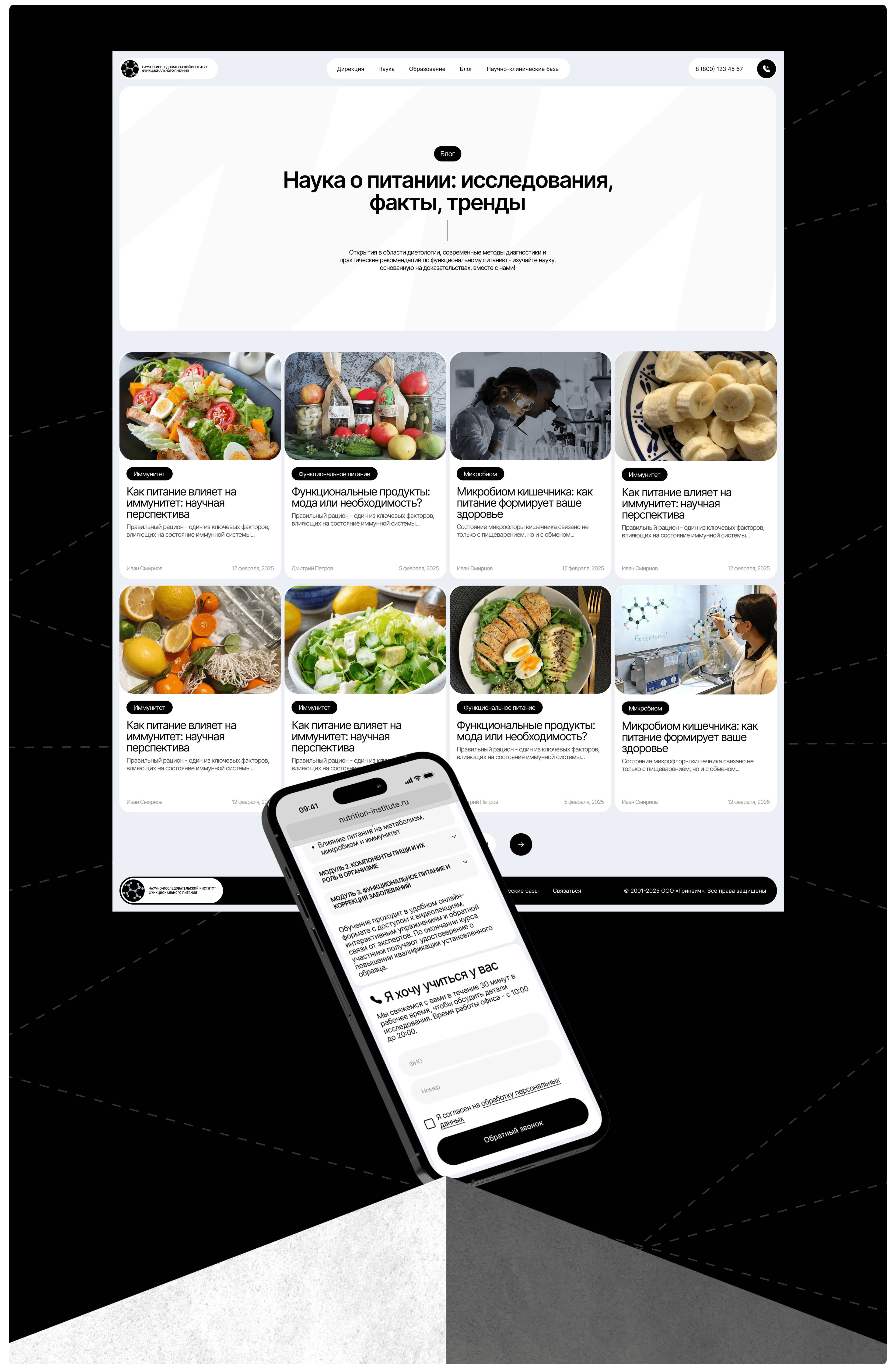 Научно-исследовательский институт функционального питания — образовательная организация в сфере здорового и медицинского питания. Данный коммерческий проект выполнялся пока я был в ExtentLab: я самостоятельно реализовал дизайн сайта с нуля.